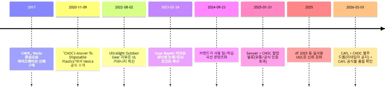 이후, 1L 물병인 베시카와 워터백 라인업인 벡토. 그리고 소프트 플라스크인 히드라암등을 출시하며, 하이커 커뮤니티 내의 소비자들의 피드백을 적극적으로 흡수하며, “테스트/고객 피드백/리턴을 기반으로 계속 개선된다”는 메시지를 보여주게 된다. 아마도 크녹의 탄생 배경 자체가 그 하이커 문화 그 자체에 기인하기 때문이지 않을가?